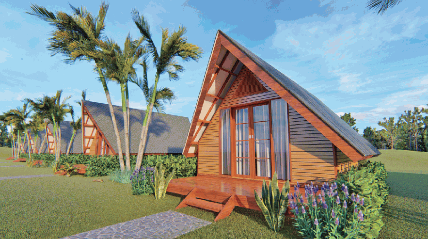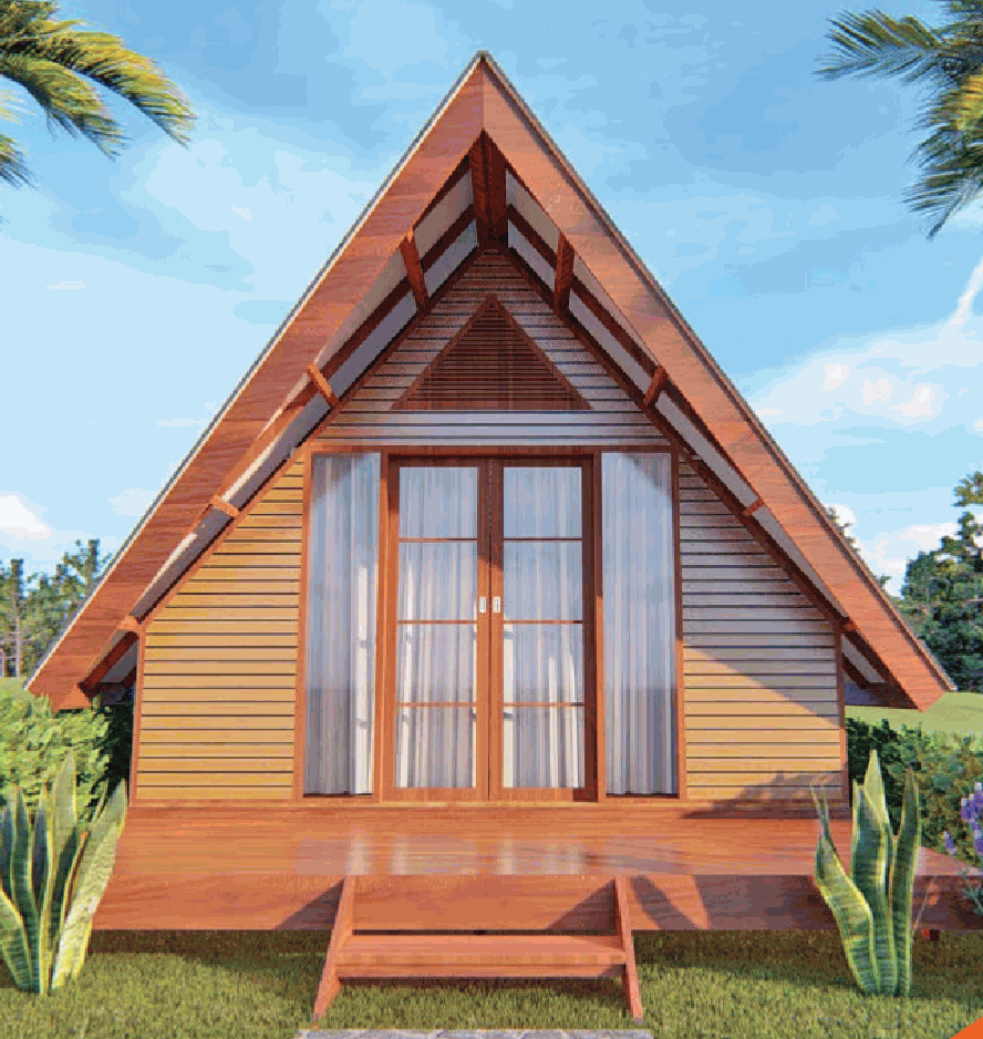 Rumah kayu bergaya A-frame ini tampil sederhana namun elegan, dengan fasad simetris, pintu kaca ganda yang menawan, serta teras kecil yang hangat. Desainnya cocok untuk hunian santai di alam terbuka, memberi kesan minimalis dan nyaman. 🌿🏑✨